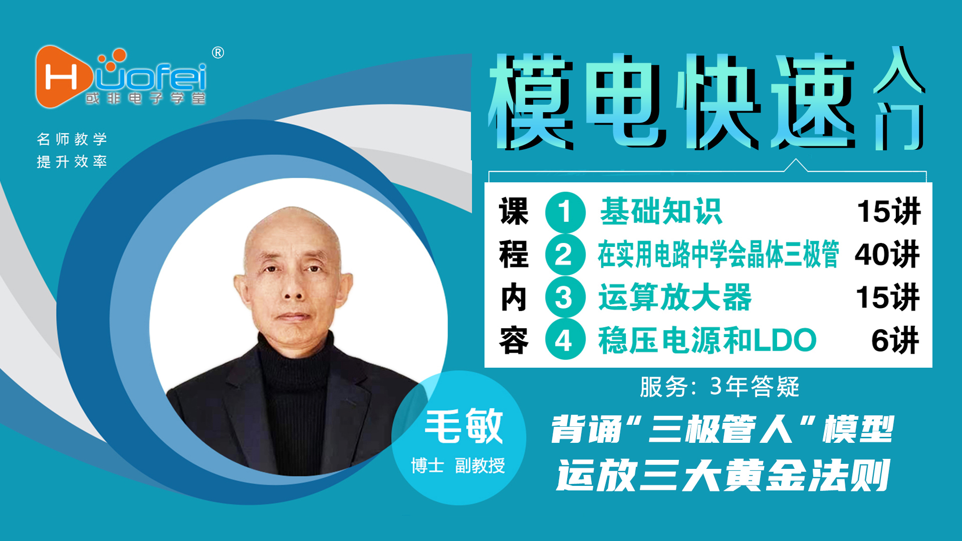 《模电快速入门》是华东师范大学毛敏老师专为或非电子学堂打造的模拟电子技术视频课程,毛老师是HIFI发烧友,光电子学博士,副教授,擅长用电子技术解决生产和科研中的问题,常常出现在生产车间和电子实验室。后转为电子技术和嵌入系统的教学,在教学过程中发现,市面上的电子类教材,居然没有完整电路图,导致学生学完后看不懂电路。不会画电路图,更不会设计。所以这个课程要给大家50个以上的完整电路图,并教大家识图,计算,最终自己设计。